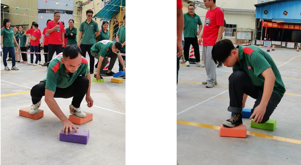 第五個(gè)項(xiàng)目:摸石頭過(guò)河。每名隊(duì)員手拿三塊磚頭過(guò)河,6名隊(duì)員接力完成,每人走10米。這個(gè)項(xiàng)目手腳的協(xié)調(diào)性要求很高,有些隊(duì)員為了不犯規(guī)加時(shí),用最簡(jiǎn)單的辦法三塊磚前后移動(dòng),也是一個(gè)非常棒的辦法,本項(xiàng)目在有條不紊的比賽中充分體現(xiàn)了廣味源人務(wù)實(shí)篤行,行穩(wěn)致遠(yuǎn)的合作態(tài)度。